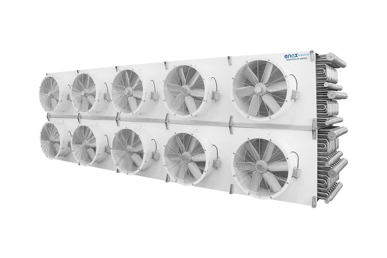 Manufactured with stainless steel tube and aluminium fin (StSt/Al). Compatible with all refrigerants (NH₃, CO₂, glycol, HFC, etc.). Modular design from 2 to 15 axial fans (Ø800, 900). Fins pitch: 7-10-12 mm.